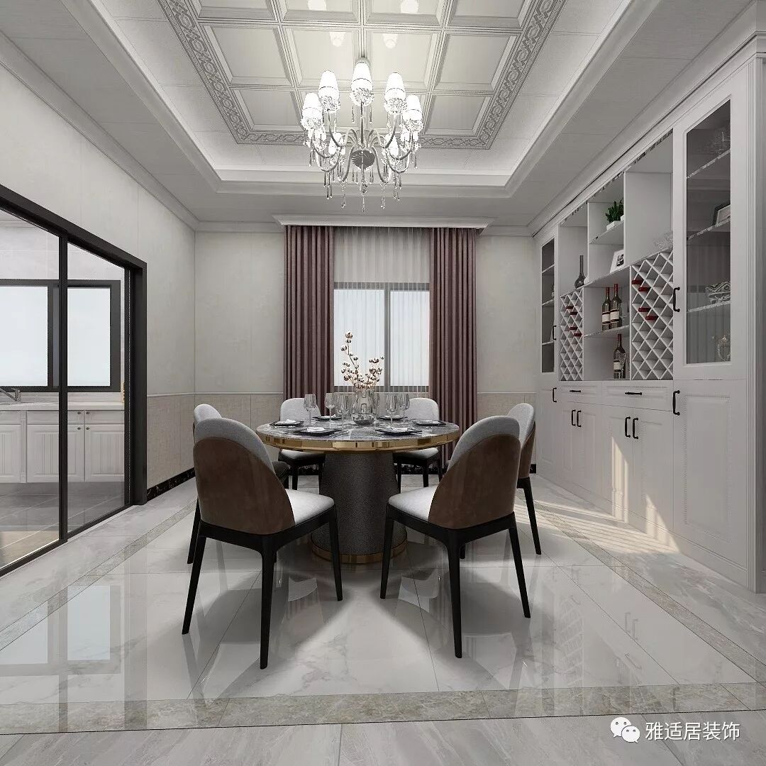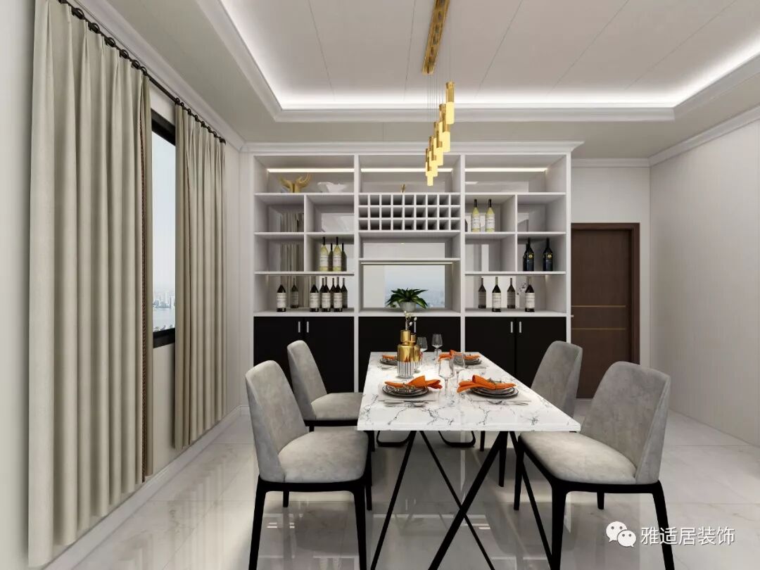 餐厅:延续着客厅的主调,同样背景墙,同样的点缀饰 品,让空间细节之处都丝丝相扣,这就是整体家装设计亮点一部分——协调性。